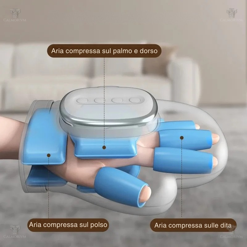 All'interno del guanto sono presenti diverse sacche che tramite la compressione dell'aria massaggiano in modo mirato la mano.